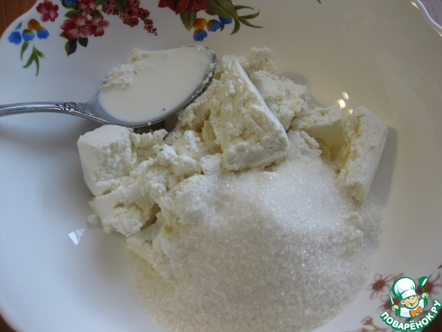 Тем временем подготовим начинку, - в творог добавить сливки (или сметану), сахар по вкусу, - хорошо все растереть. Если начинка получилась жидкой (как у меня), добавьте крахмал, если же у вас был творог сухой и не "потек", тогда крахмал добавлять не нужно.