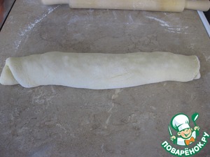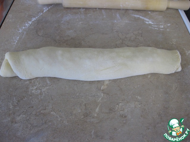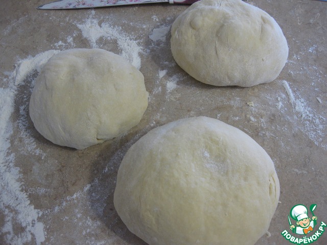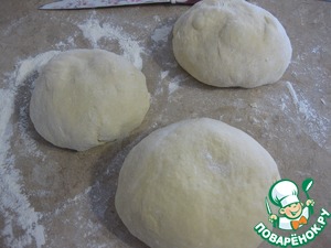 Рабочую поверхность стола припорошить мукой, тесто разделить на 3 части для более удобной работы с ним