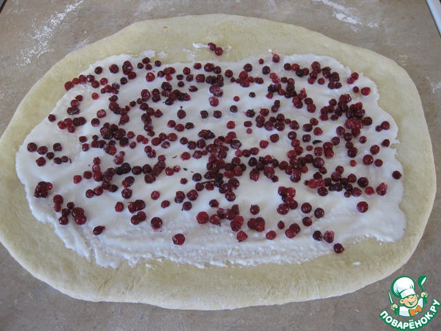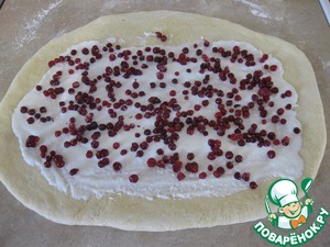 Теперь каждую часть раскатать в пласт толщиной примерно 0,5 см, смазать его 1/3 частью творожной начинки и посыпать брусникой,