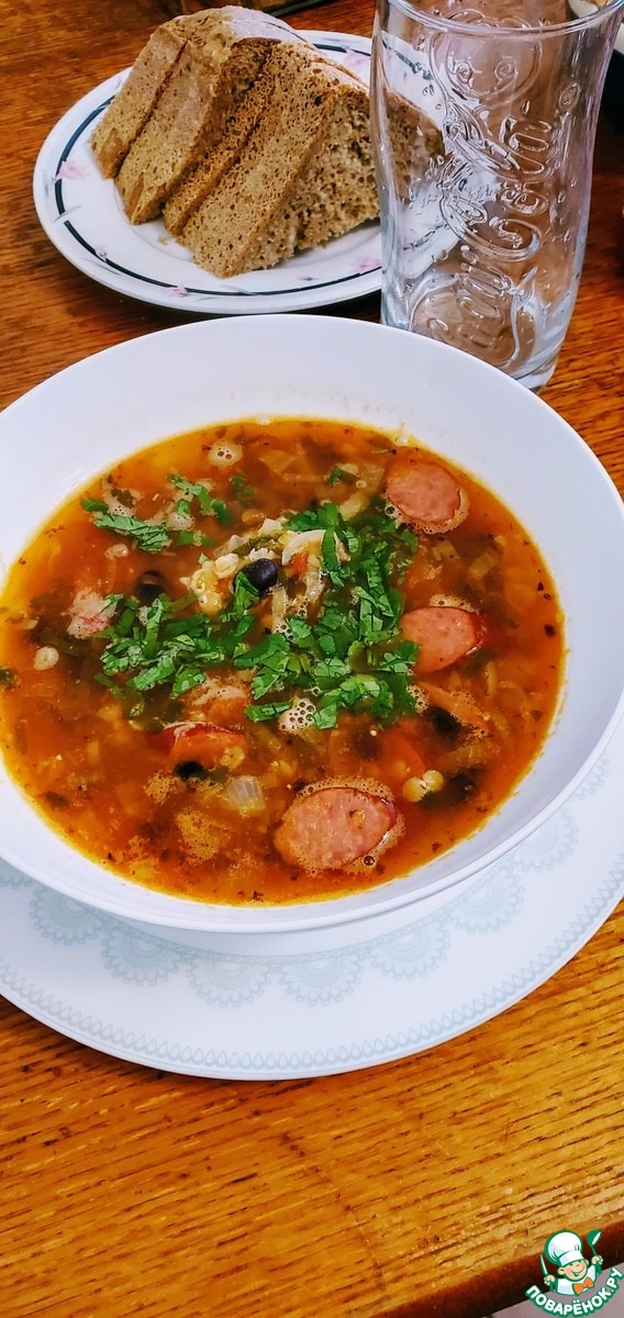 Добавить колбасу в суп и поварить еще 10 минут. Посолить и поперчить по вкусу.