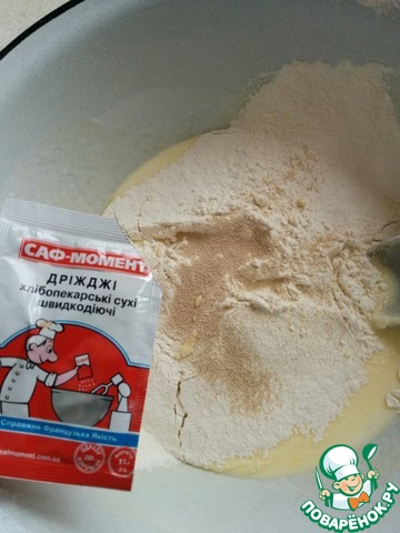 Затем просеиваем 200 г муки и добавляем дрожжи саф-момент. Замешиваем тесто сразу ложкой.