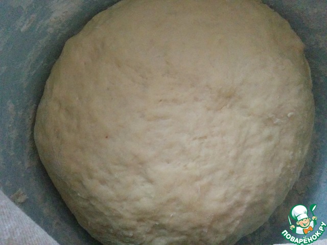 Оставляем тесто в миске на часик, чтобы увеличилось в два раза. Накроем полотенцем.