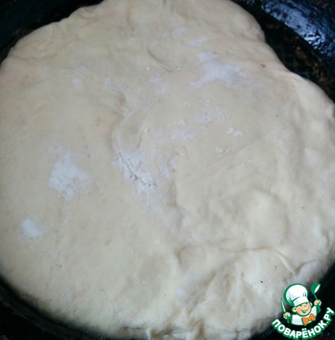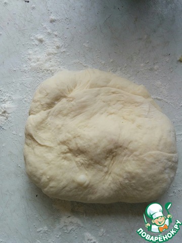 Когда наше тесто подошло, присыпаем мукой стол и обминаем его хорошо руками, чтобы вышли все пузырьки из теста.