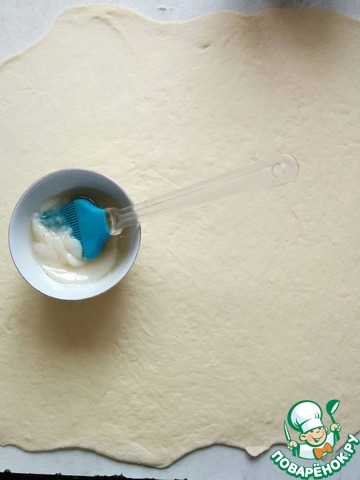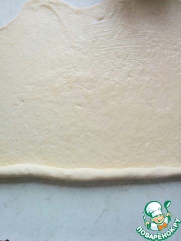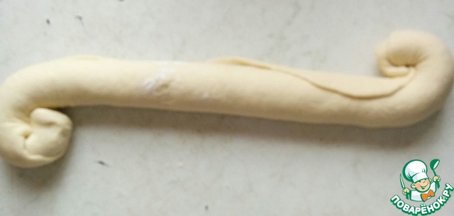 Когда смалец застынет на тесте, начинаем его скручивать в рулет, от края.