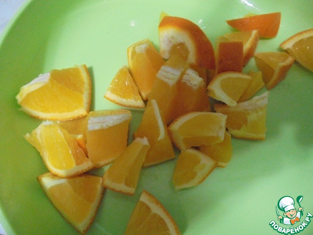Апельсин вымыть, обсушить, нарезать вместе с кожурой на кусочки.