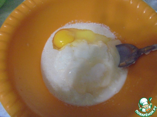 К опаре добавить щепотку соли, яйцо, мягкий творог. Перемешать.