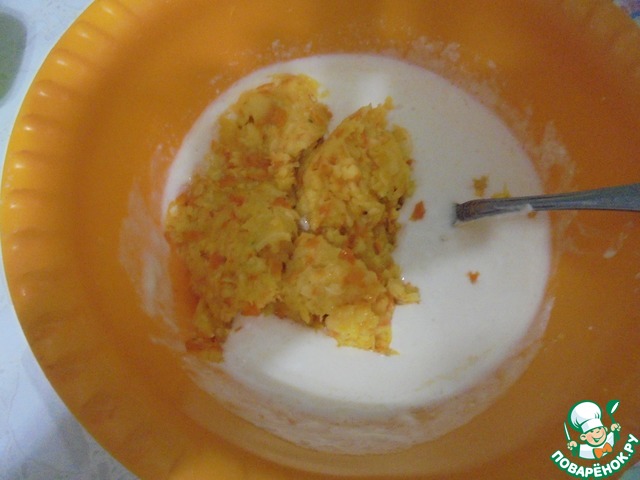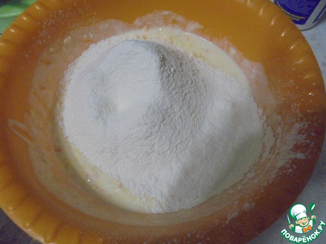 Добавить просеянную муку (муки может понадобиться чуть больше, в зависимости от консистенции творога и размера апельсина).