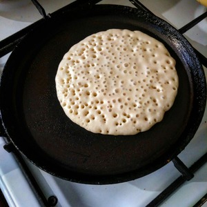 Сковороду смазать растительным маслом и налить туда половину половника теста и жарить только с одной стороны до румяного цвета.