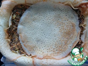 В серединку обязательно нужно положить блинчик, чтобы не было зазоров. Выкладываем половину начинки.