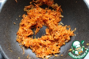 Лук почистить и мелко нарезать. Морковь почистить и натереть на крупной терке. На сковороде разогреть 1 ст. л. масла. Добавить нарезанный лук, обжарить его до прозрачности. Затем добавить морковь и держать на огне 2-3 минуты.