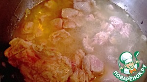 Затем добавить 1,5 л горячей воды, досолить по вкусу. и варить еще 10 минут -
