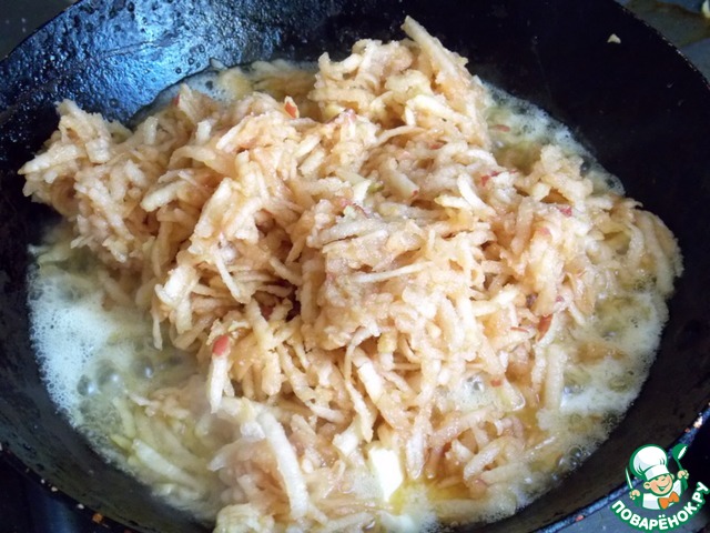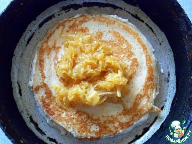 Кладем блин и на него нанести яблочную начинку. Разровнять.