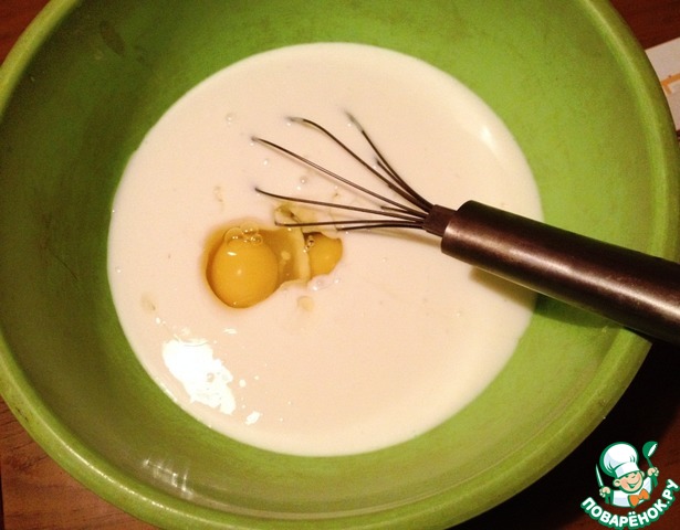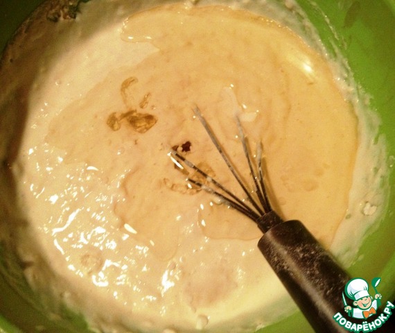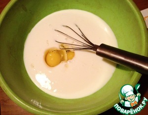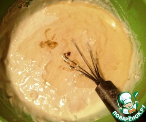Оставшиеся яйца взбить со сметаной, щепоткой соли и щепоткой сахара.
