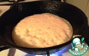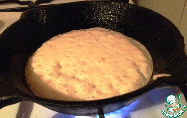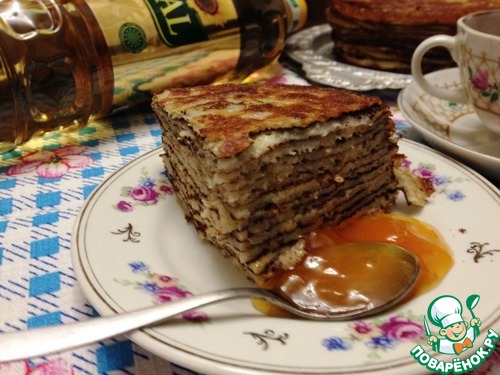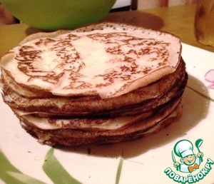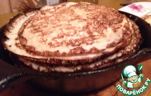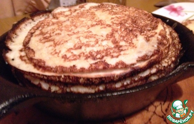 Выпечь блины на разогретой и смазанной маслом сковороде блины. Смазывать один раз перед выпечкой первого блина.