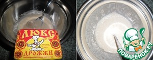 • Дрожжи развести в теплой воде, добавить 1 ч. л. сахара + 1 ст. л. муки. Поставить опару в тёплое место на 1 час. После того как она увеличилась в разы шапочкой и осела приступаем к замесу теста.