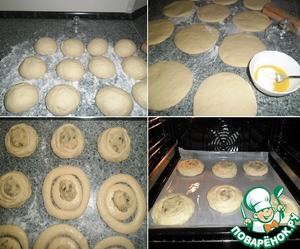 Раскладываем на противень, который можно смазать маслом, либо накрыть промасленным пергаментом. Смазать верх взбитым желтком и дать расстояться тесту минут 10-15.