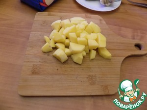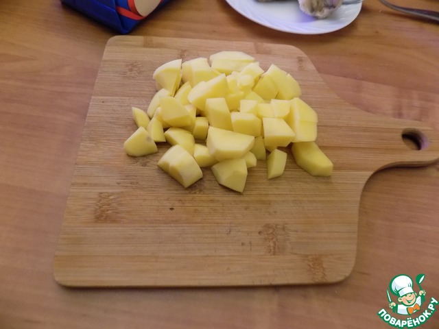 • Картофель режем небольшим кубиком и отправляем в кипящую смесь рыбного бульона и сливок.