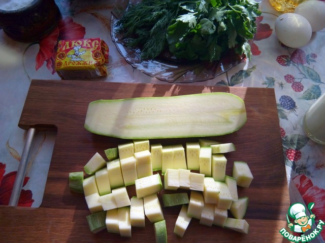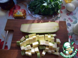 Кабачок нарезаем на кусочки, крупно рубим зелень.