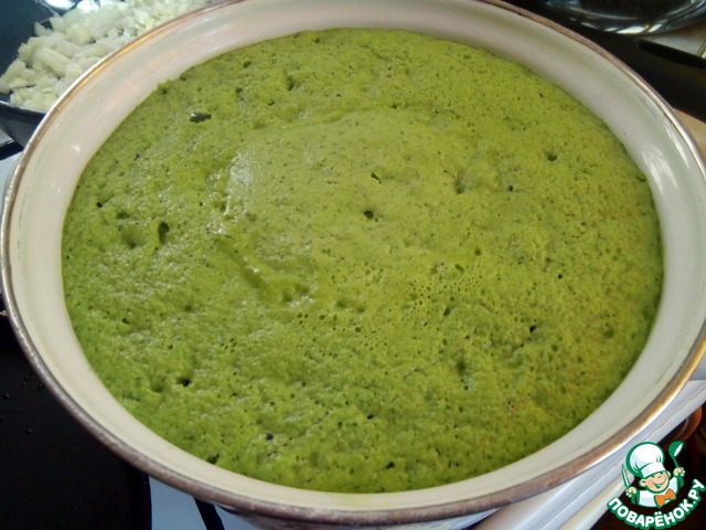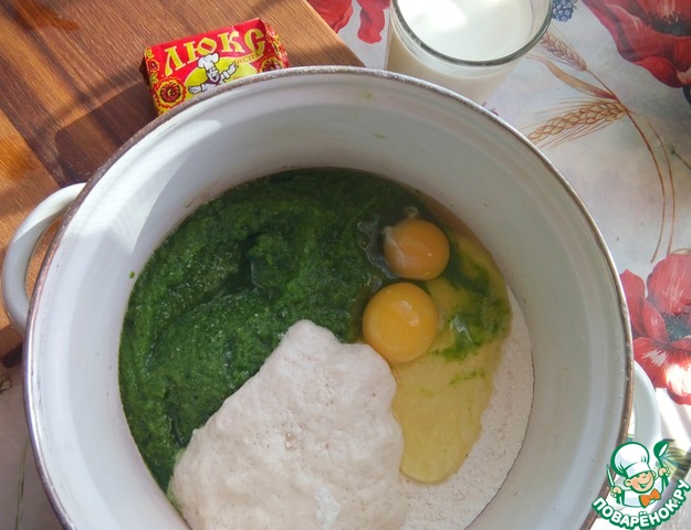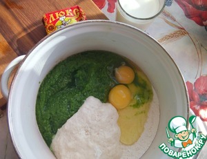 Соединяем в подходящей посуде муку, овощное пюре, яйца, дрожжи, соль и молоко. Для удобства я пробиваю тесто блендером, что помогает избавится от комочков. Тесто накрываем, ставим в теплое место на 45-60 минут для подъема.