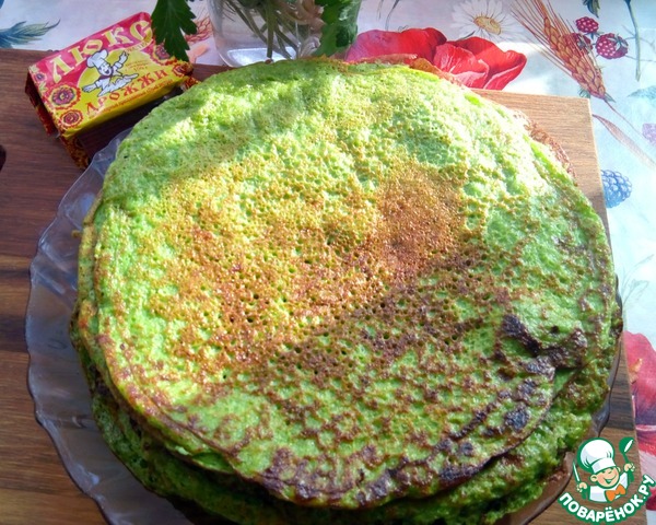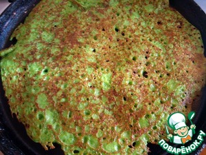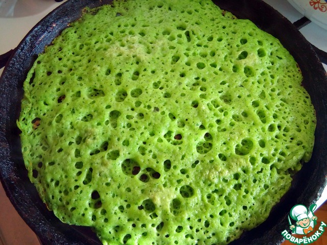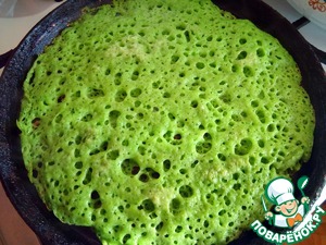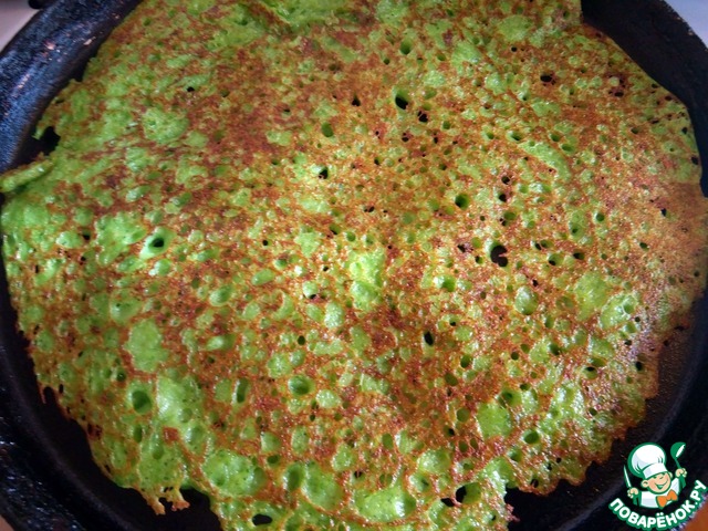 Наливаем тесто половником. Тесто очень нежное, поэтому не стремитесь делать слишком большие блины, т. к. вам будет трудно их переворачивать, чтоб не порвать. У меня было пару порывов блинов.