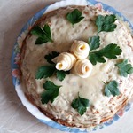 Накрываем наш торт блином, смазываем остатками соуса и посыпаем остатками сыра. Перед подачей на стол торт нужно запечь в духовке при 180С 10 минут, чтоб сыр расплавился.