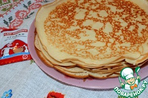 Испечь тонкие блинчики, в моем случае большие - 28 см..
