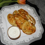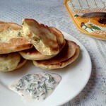 На твоем фото вижу соус к оладьям, а мы их покушали с чаем на обед. Очень понравились оладьи!