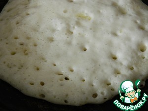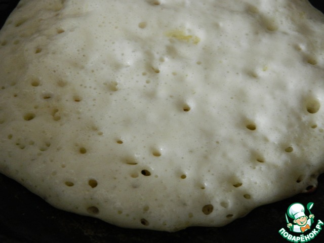 Тесто очень нежное, воздушное, пузырчатое, с пузырьками воздуха, выкладываем его на сковороду просто половником, при этом оно не растекается как обычное тесто, это надо учесть.