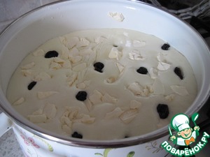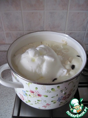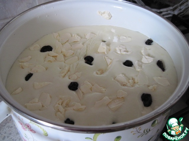 Как только тесто начнет подниматься к самому верху кастрюли, добавим масло, изюм.