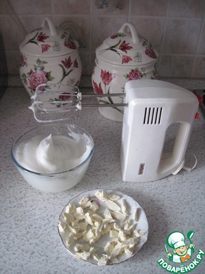 Взбить белки до состояния крепкой пены. Масло должно полежать немного в морозильнике, так его удобнее настругать ножом или натрем его на крупной терке.