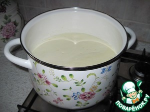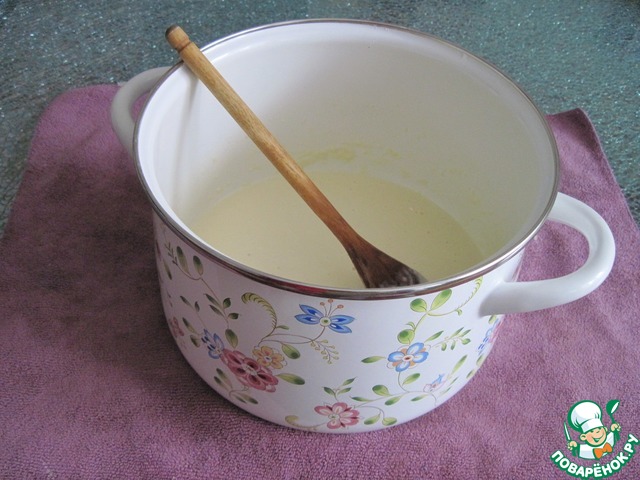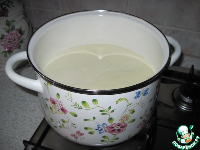 В кастрюлю емкостью 5л всыпать муку, добавить оставшееся молоко, сахар, соль, желтки и размешать.