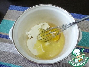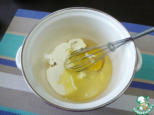 В другой кастрюльке взбить яйцо с со сметаной, с сахаром и солью, влить растопленное масло.
