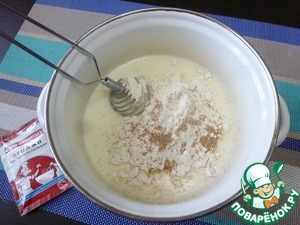 • Разболтать яйца с сахаром и солью. Смешать кефир с теплой водой. Соединить всё вместе.