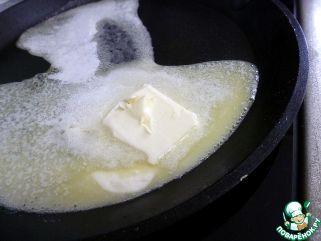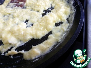 • Вылить на сковороду и жарить пока масса не начнет густеть. Не передержите, на это уйдет немного времени. Начинка из заварных яиц должна быть нежной.