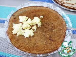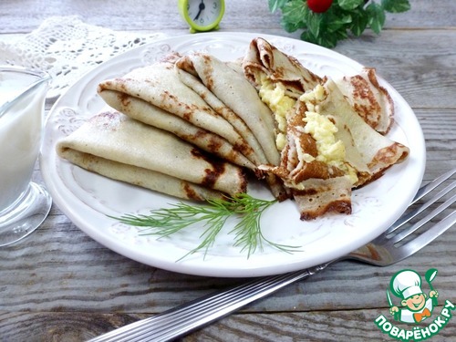 • Фаршируем блинчики заварными яйцами, кому ка нравится (конвертом, рулетом или уголком). Указанных продуктов для начинки хватает на 4 блина.