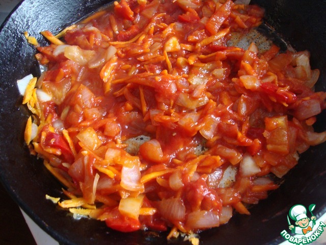 Лук, морковь, болгарский перец измельчить и обжарить на сковороде с подсолнечным маслом. Добавить помидор и томатную пасту.