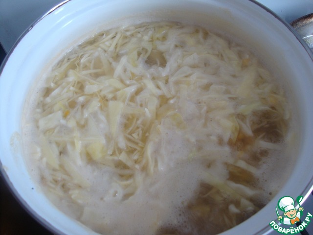 После того, как закипит горох, снимаем пену и сразу закладываем капусту. Минут через 20 добавляем картофель, зажарку.