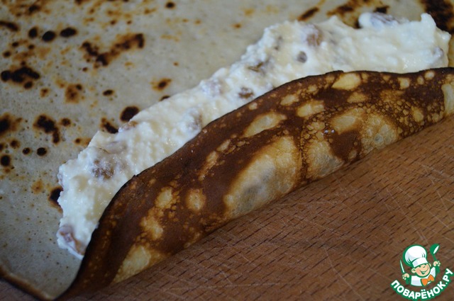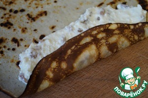 Блинчики наполнить творожной массой и свернуть трубочками.