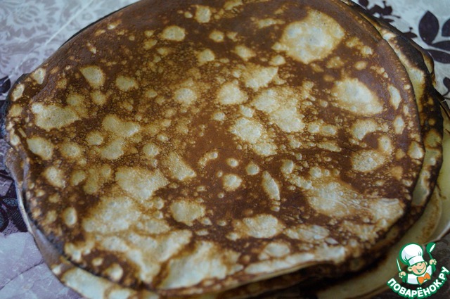 В теплом молоке разведем дрожжи и сахар, затем добавим яйца, соль и муку. Замесим тесто и оставим для подъема на час. Испечем блинчики. Для пирога нам понадобится 10 штук.
