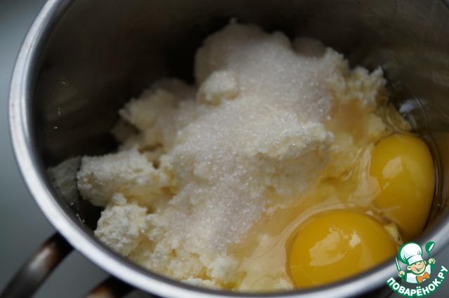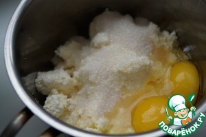 Приготовим начинку. Творог надо перемешать с сахаром и яйцами. Творог надо брать не сухой.