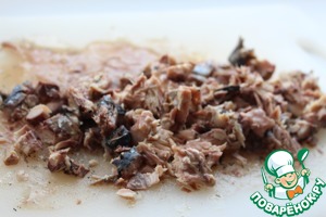 У меня консервы со скумбрией. Удалить косточки и нарезать на кусочки.