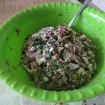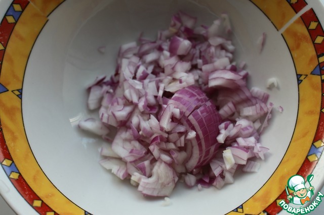 Лук почистить и мелко нарезать. Залить ледяной водой и дать постоять 10-15 минут, затем воду слить, а лук отжать.