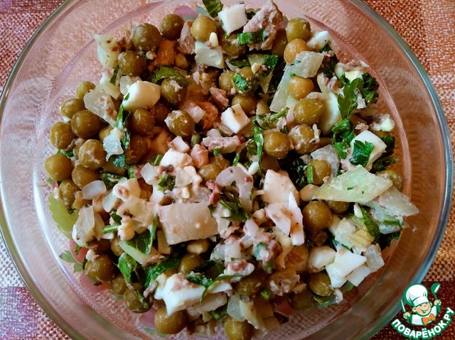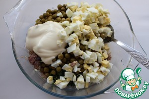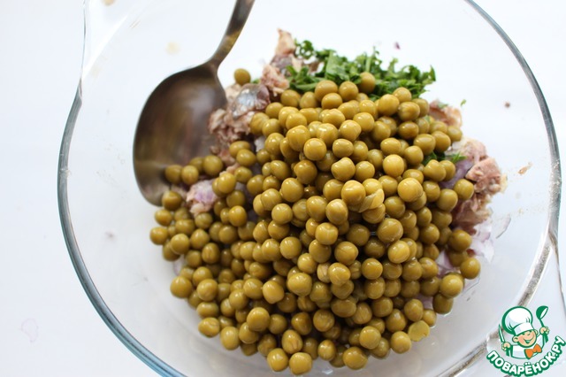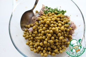 Смешать лук, рыбу, измельченную зелень и горошек.