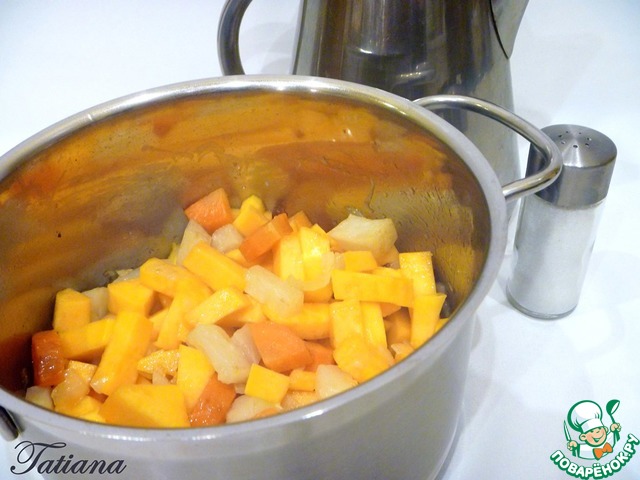 Пока варится фасоль, займитесь приготовлением тыквенного супа: почищенные овощи (лук-морковь-корневой сельдерей) произвольно нарежьте. В кастрюле с толстым дном, на растительном ( рафинированном) масле потушите