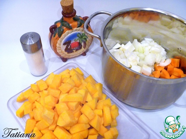 Пока тушатся овощи, так же произвольно нарежьте тыкву и вскипятите воду.