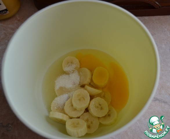 Растереть до однородной массы банан с сахаром, солью и яйцами.
