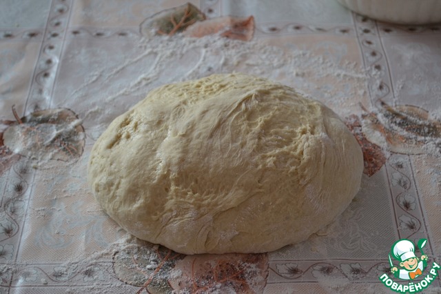 • Когда тесто хорошо поднимется, обмять и выложить его на стол, присыпанный мукой. Если тесто липнет к рукам, то добавьте ещё немного муки и хорошо вбейте.