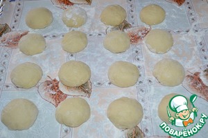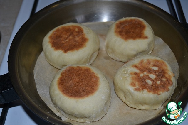 На сухую сковороду положить бумагу для выпечки. Маслом смазывать не надо. Если ваша посуда с хорошим покрытием, то бумага не понадобится. Выложить пышки, слегка прижать ладошкой, накрыть крышкой и зажечь огонь. Жарить с обеих сторон на медленном огне, на конфорке среднего размера.