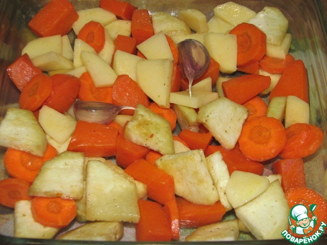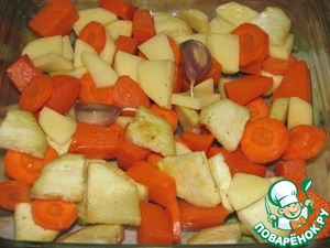 Овощи выложить в подходящую форму, сбрызнуть маслом, посолить, перемешать. Туда же положить неочищенный чеснок.
