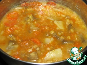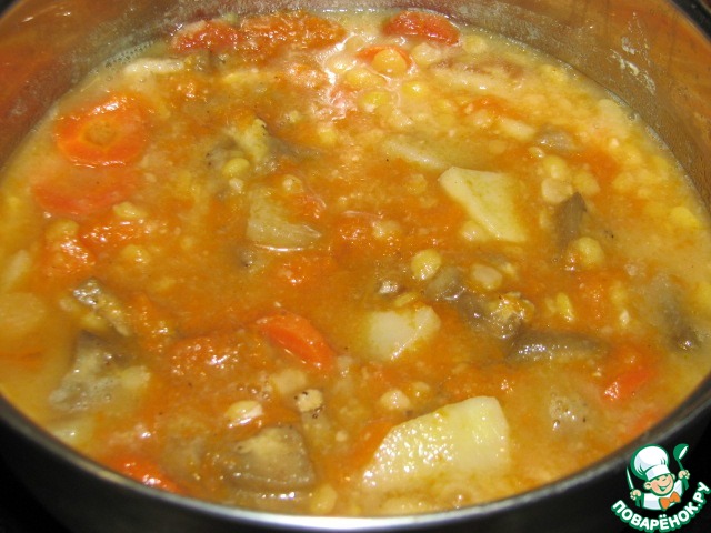 Запеченные овощи (кроме чеснока) переложить в кастрюлю с горохом, проварить в течение 5 мин.